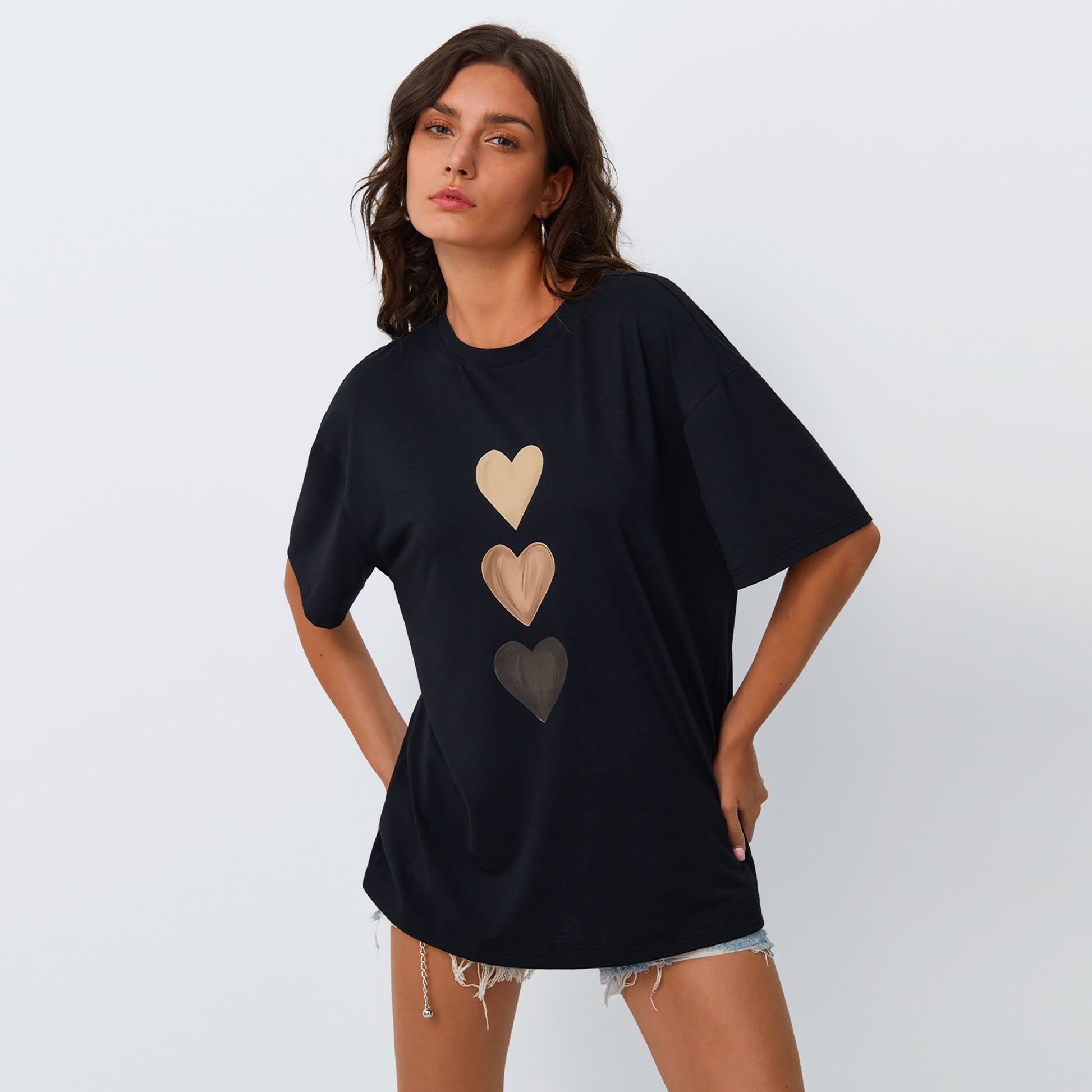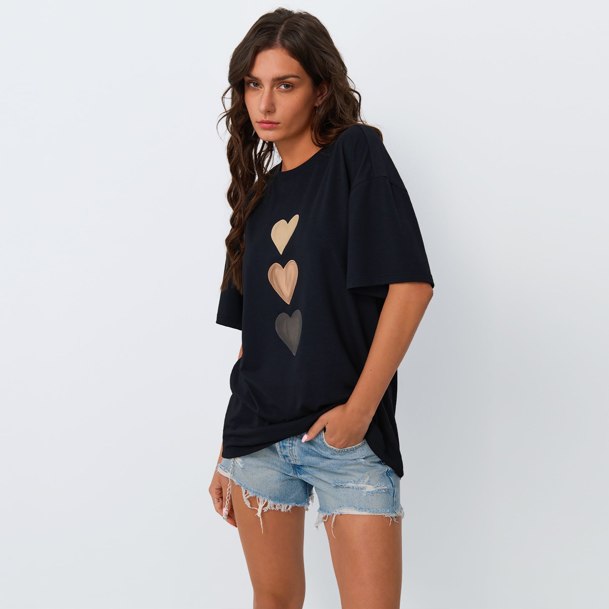 Hearts Design T-shirt: Featuring a vertical row of heart shapes in varying shades, this shirt symbolizes love and unity, ideal for those looking for a simple yet impactful style.